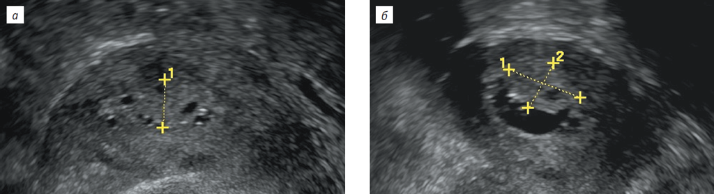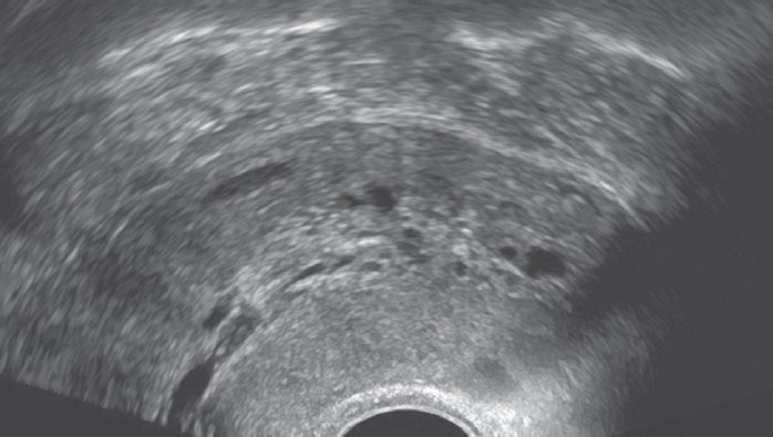 При трансвагинальном УЗИ эстрогеноподобное действие тамоксифена (развитие кистозной атрофии эндометрия) проявляется увеличением толщины эндометрия за счет стромальной пролиферации, возникновением субэндометриальных кист, неровностью границы эндометрий/миометрий, эндометрий приобретает вид «пчелиных сот» (рис. 1) [18, 19].
