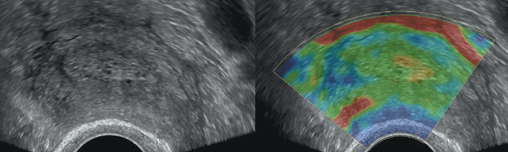 Fig. 2. Patient V., 5 years postmenopausal, after 3 years 8 months of Tamoxifen therapy. Endometrial thickness = 10 mm. Endometrial tissue is avascular (colour Doppler imaging) and soft (elastography). Cystic endometrial atrophy