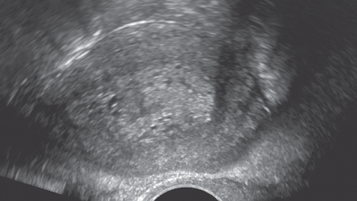 Рис. 1. Пациентка Н., постменопауза 9 лет. Прием тамоксифена 3 — года 5 месяцев. Толщина эндометрия — 10 мм. Структура эндометрия — гиперэхогенная, с щелевидными кистозными включениями. Эндометрий — аваскулярный. Визуализируются субэндометриальные кисты. Граница эндометрий/миометрий — нечеткая (кистозная атрофия эндометрия)