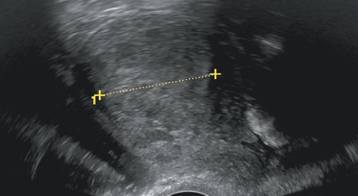 Fig. 3. Patient K., 8 years postmenopausal, after 5 years of Tamoxifen therapy. Endometrial thickness is increased to 18 mm