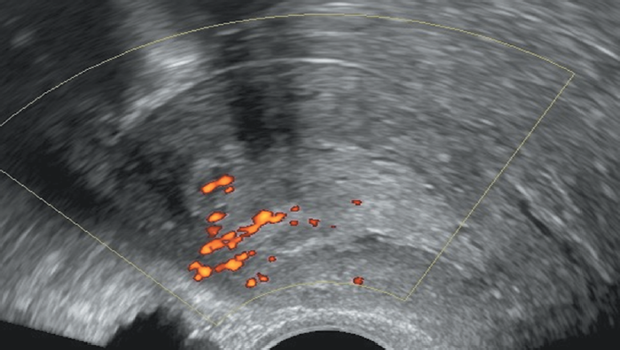 Fig. 5. After 5 years of Tamoxifen therapy. In the uterine cavity, an oval shaped hyperechoic lesion with clear contours, a thin halo and a feeding vessel within the base along its front wall (endometrial polyp) is visualized