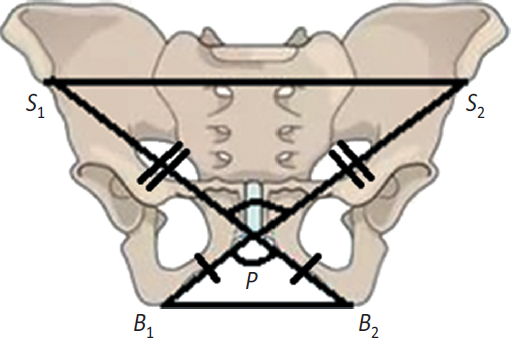 В области костного таза можно выделить два подобных равнобедренных треугольника: ∆S1S2P и ∆B1B2P (рис. 2).