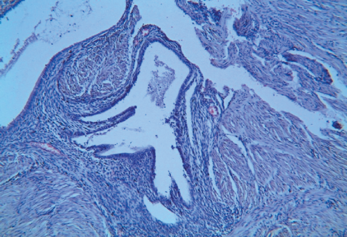 При проведении гистологического исследования авторами описаны два варианта склеротической формы аденомиоза: при первом варианте очаги аденомиоза располагались между пучками гладкомышечных волокон, а при втором — в ткани узла лейомиомы.