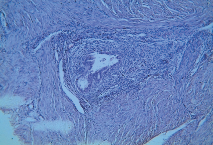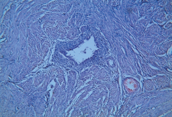 Рис. 5. Склеротическая форма аденомиоза. Очаг эндометриоза в лейомиоматозной ткани. Окраска гематоксилином и эозином. Увеличение ×10