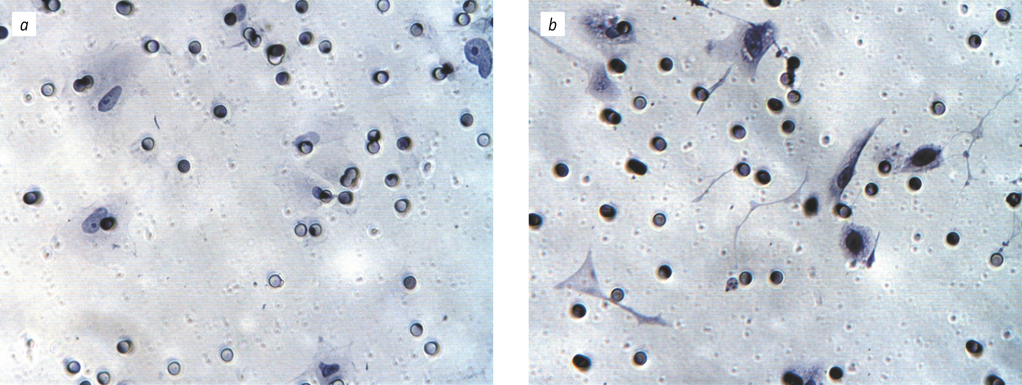 Рис. 1. Анализ инвазии клеточных культур по хемоаттрактанту (увеличение ×40): a — контрольная клеточная культура эндометрия; b — клеточная культура эндометрия от пациенток с наружным генитальным эндометриозом