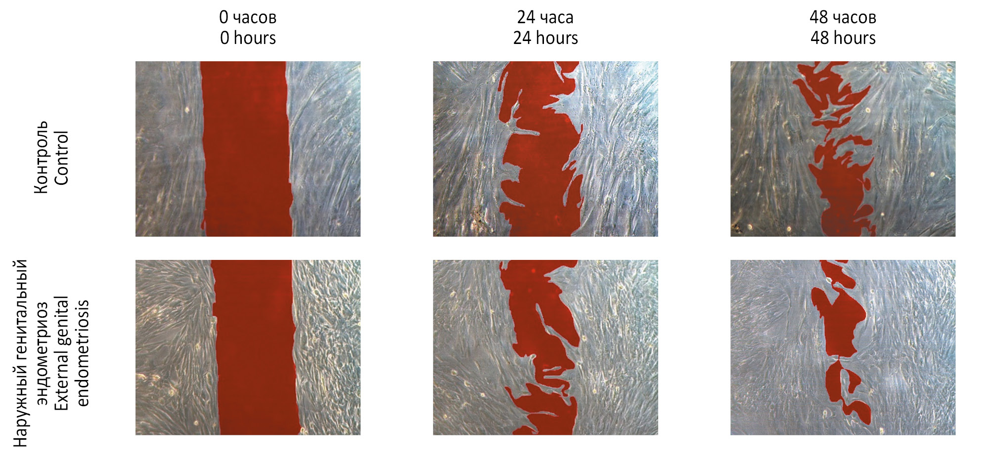 Ранее исследователями не было выявлено существенных различий между пролиферативной активностью клеток при эндометриозе и у здоровых пациенток [28]. Мы изучали подвижность этих двух культур клеток с помощью Scratch-теста. Изменения числа клеток в ране, их местоположение и форму фиксировали с помощью цифровой фотокамеры. При анализе полученного материала установлено, что клеточные линии принципиально различаются между собой по миграционной способности. В контрольной культуре клеток через 24 ч площадь раны составляла 27,29 % от площади препарата, через 48 ч — 17,61 %. В культуре от пациенток с НГЭ площадь раны через 24 ч равнялась 20,77 %, через 48 ч — 8,21 % (рис. 2). Данные различия статистически достоверны (р < 0,05) и, возможно, связаны со способностью кисспептина ингибировать миграцию клеток. Исходя из ширины раны, мы рассчитали расстояние миграции и скорость движения клеток, которая оказалась 36,53 мкм/ч. Так как в клеточной культуре от пациенток с НГЭ был снижен уровень KISS1, миграционная активность этой линии была повышена по сравнению с контролем. Однако стоит отметить, что на эти различия могут влиять индивидуальные особенности пациенток, от которых был получен материал эндометрия: гормональный фон, возраст, особенности течения эндометриоза, сопутствующие заболевания и т. д. В ряде исследований было показано, что активация KISS1R с помощью KISS1 ингибирует подвижность клеток, пролиферацию, инвазию, хемотаксис и образование метастазов [29–31].