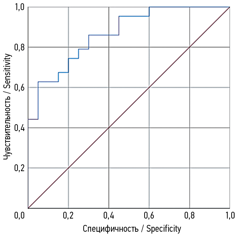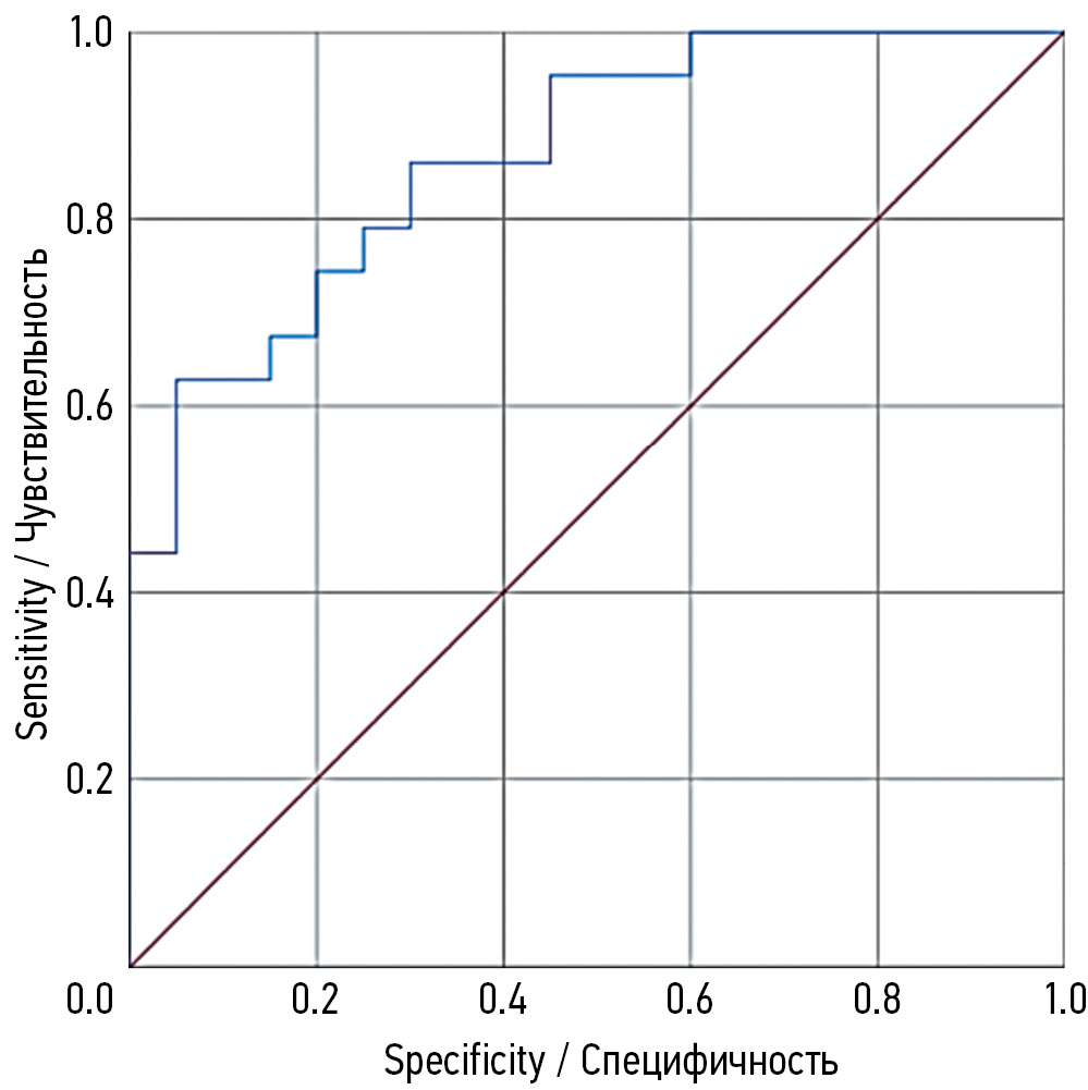 The sensitivity of the developed prognostic model is 0.86, and the specificity is 0.70. The area under the ROC curve is 0.87 (95% confidence interval 0.78–0.96; p < 0.001). The standard error is 0.046 (Figure).