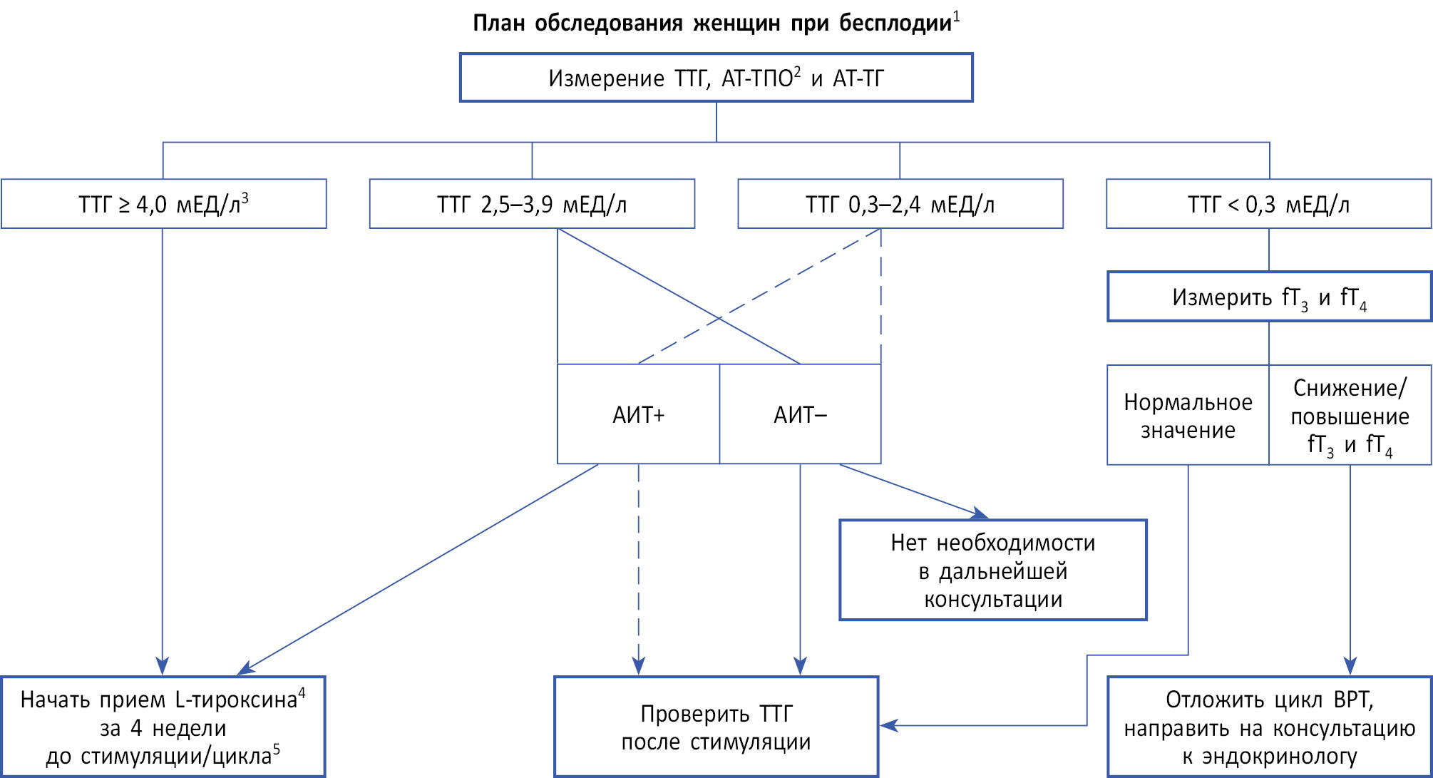 Fig. 1. Algorithm for the examination and management of women in preparation for IVF / ICSI. ТТГ, thyroid-stimulating hormone; АИТ, autoimmune thyroiditis; АТ-ТПО, autoantibodies against thyroid peroxidase; АТ-ТГ, antibodies against thyroglobulin; 1 measure only in case of ovarian causes or idiopathic infertility; 2 when a choice has to be made, measure autoantibodies against thyroid peroxidase; 3 or above institutional cut-off; 4 dose depending on baseline thyroid-stimulating hormone level; 5 thyroid-stimulating hormone target < 2,5 mIU/L