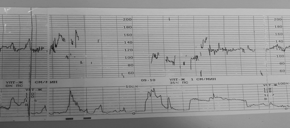 Анализ приведенного случая подтверждает необходимость постоянного кардиомониторного контроля в родах пациенток группы высокого риска. Родоразрешение в пределах 30 мин после постановки диагноза острой гипоксии, адекватное ведение новорожденного в асфиксии позволяют надеяться на относительно благоприятный исход родов. Рекомендуемая внутриматочная реанимация, по нашему мнению, также способствует улучшению состояния плода.