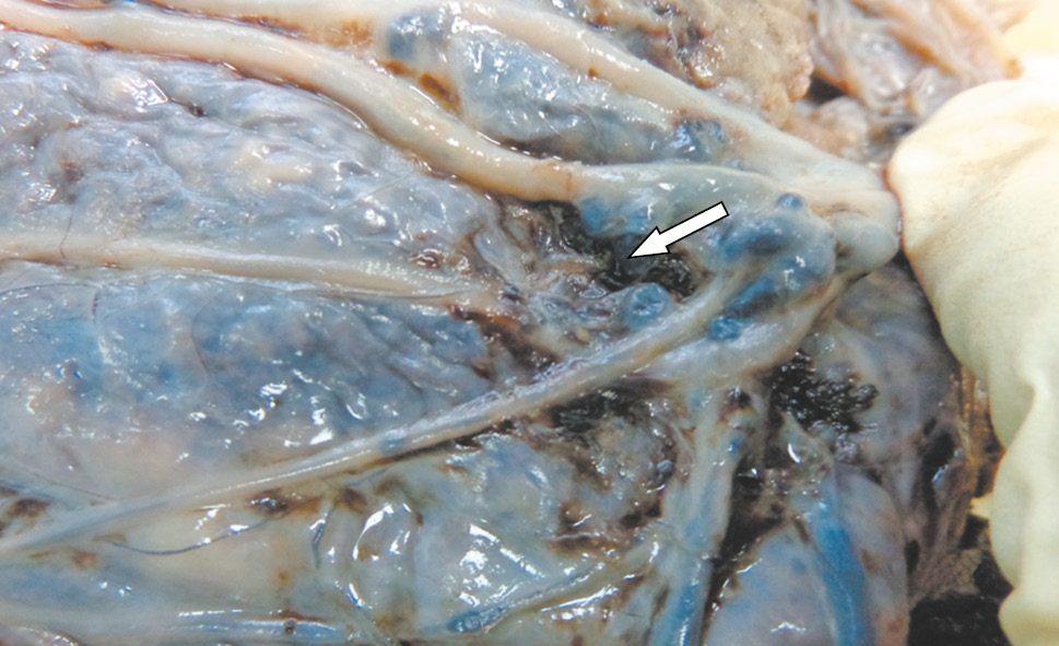 Плацента с низкой массой 378 г (16 перцентилей, медиана — 480 г) и низким плацентарно-плодовым коэффициентом 0,11 (норма — 0,13–0,19), на протяжении 1/3 периметра плаценты определялся валик, представленный широким слоем фибриноида с замурованными в нем ворсинами; дистально от валика ткань плаценты, непокрытая оболочками, шириной до 4 см с кровоизлиянием. Пуповина длиной 70 см прикреплена к плаценте в области валика, имеет признаки рассыпного прикрепления: преждевременное разветвление сосудов пуповины с дефицитом вартонова студня вокруг них на протяжении 2 см. В месте прикрепления пуповины определяется щелевидный дефект хориальной пластины с разрывом одного из сосудов (рис. 2). Строение и васкуляризация ворсинчатого дерева соответствовали сроку беременности; воспалительные изменения в последе отсутствовали.