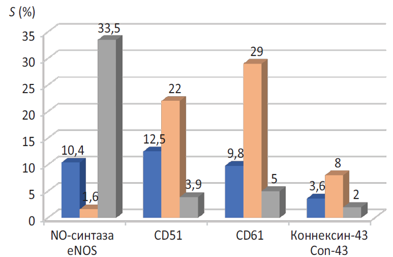 Иммуногистохимическое исследование проводили с использованием моноклональных мышиных антител к CD51 (Clone CJ00, 1 : 100, Novocastra), CD61 (Clone 2f2, 1 : 50, Novocastra), Connexin-43 (Clone IgG1; 1 : 50, Shymicon), NitricOxide Synthase-3 (Clone RN5, 1 : 40, Novocastra). В качестве вторых антител использовали универсальный набор, содержащий биотинилированные антимышиные и антикроличьи иммуноглобулины. Визуализацию окрасок проводили с применением комплекса авидина с биотинилированной пероксидазой (ABC-kit), с последующим проявлением пероксидазы хрена. Для негативного контроля во всех случаях применяли блокирующую сыворотку (DAKO LSAB 2 kit). Количественную оценку результатов иммуногистохимических реакций выполняли с помощью системы компьютерного анализа микроскопических изображений, состоящую из микроскопа NikonEclipse E400, цифровой камеры Nikon DXM1200, персонального компьютера на базе IntelPentium 4, программного обеспечения АСТ-1, версия 2.12, и «Видеотест-Морфология 5.0». В программе «Видеотест-Морфология 5.0» оценивали экспрессию исследуемых белков в ткани, используя показатель средней оптической плотности, показатель относительной площади иммунопозитивного окрашивания, которую рассчитывали как соотношение площади окрашенных клеток к относительной площади поля зрения. Количественную оценку результатов иммуногистохимической реакции осуществляли при помощи относительной площади экспрессии (S, %) CD51, CD61, коннексина-43, NO-синтазы в миометрии нижнего сегмента матки.