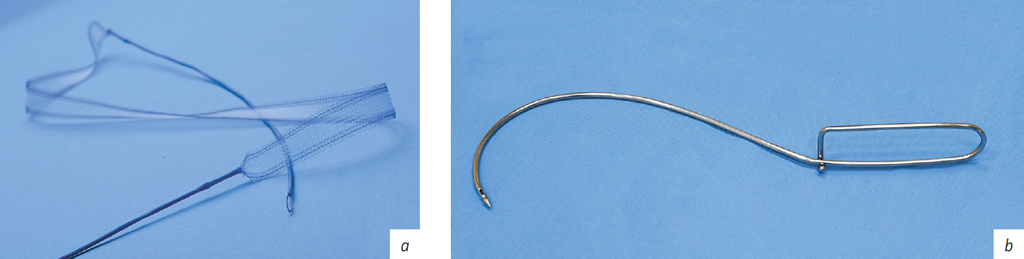 Рис. 1. Эндопротез УроСлинг-1 (а); проводник-игла Урофикс-ПЛ, модификация 3 («серп») (b)