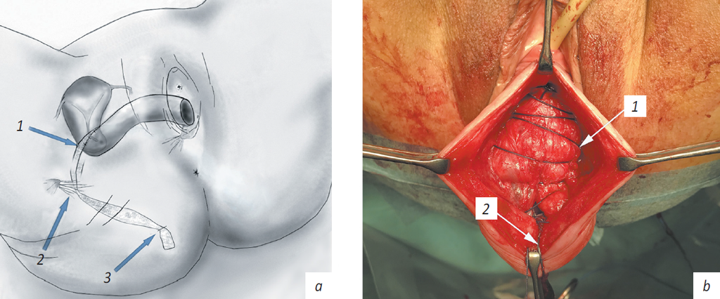 Fig. 2. Main steps of the surgery: a — the sling position: 1 — the sling fixed to the cervix, 2 — sacrospinous ligament, 3 — the distal part of the sling conducted through the incision in the gluteal region; b — subfascial colporrhaphy: 1 — the suture laid on the internal surface of the fascia, 2 — the suture tied with the ligature fixing the sling to the cervix