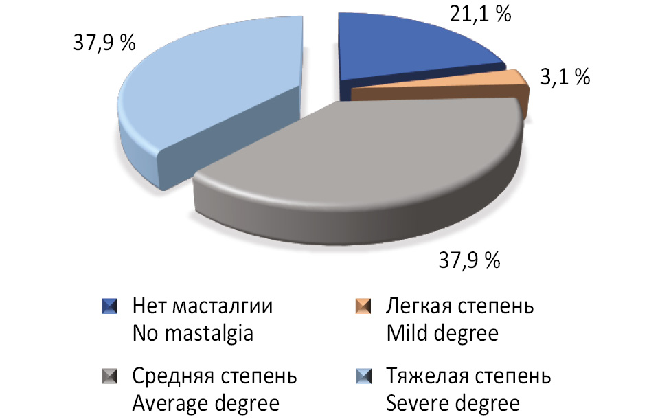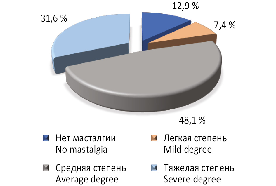 Оценку масталгии проводили при помощи визуально-аналоговой шкалы. При ≥7 баллам масталгию считали тяжелой, при 4–6 баллах — средней и при 1–3 баллах — легкой степени выраженности.