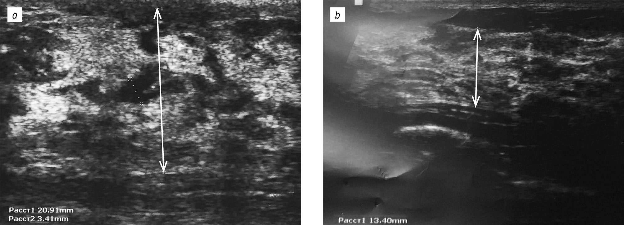 Толщину ФГЗ измеряли в верхнем наружном квадранте молочной железы вдоль радиальной линии, разделяющей квадрант пополам и сходящейся к соску, — от наружного контура переднего до наружного контура заднего листка расщепленной фасции молочной железы. После определения толщины ФГЗ в правой и левой молочной железе вычисляли ее среднюю величину.