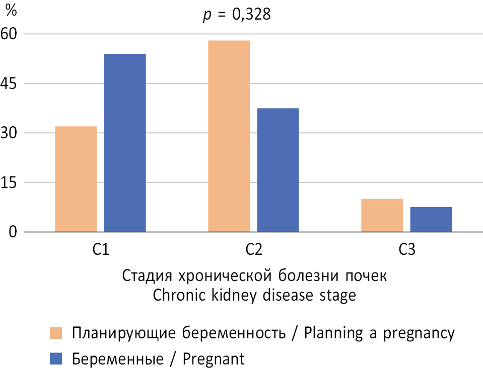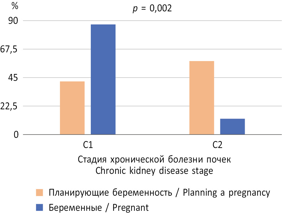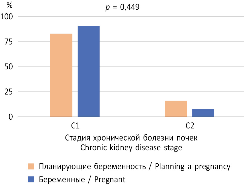 Results. The pregnant group and the planning pregnancy group were distinguished by glycated hemoglobin (p = 0.001), serum creatinine (p = 0.001), and GFR estimated by the creatinine clearance test (р = 0.017), CKD-EPIcr (р = 0.005), and CKD-EPIcr-cys (р = 0.046) equations. There was no difference in urinary creatinine, serum cystatin C, and GFR estimated by CKD-EPIcys equation and daily urinary protein excretion between the study groups. Most pregnant women (87.5%) were in stage C1 and only 12,5% in stage C2 as determined by estimated GFR using the CKD-EPIcr formula, which was significantly different compared to the planning pregnancy group, where the percentage of women in stages C1 and C2 was comparable (р = 0.002). In addition, most pregnant patients were in stage C1, while most of the patients planning pregnancy were referred to stage C2 by GFR estimated by CKD-EPIcysequation. Stage C3a was diagnosed in the both study groups only when CKD-EPIcys equation for GFR estimation was used. Most women from both groups were in stage C1 when GFR was estimated by the creatinine clearance test, the percentage ratio of patients in stages C1 and C2 in both groups being comparable.