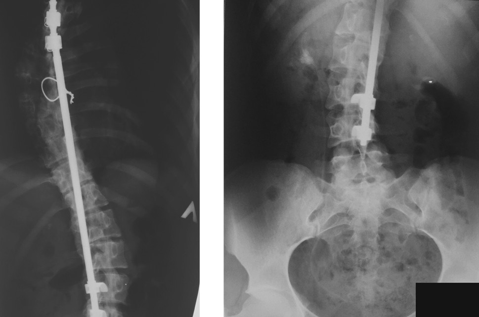 Из анамнеза известно, что пациентка страдает диспластическим правосторонним грудным сколиозом IV степени. В 2000 г., в возрасте 15 лет, у пациентки выполнены дискапофизэктомия на вершине деформации, передний корпородез, наложено краниотибиальное вытяжение. В 2001 г. (через 3 мес. от первого оперативного вмешательства) были проведены коррекция и стабилизация деформации позвоночника эндокорректором института им. Г.И. Турнера с боковыми проволочными тягами (Th4,5–L2,3), задний спондилодез аллотрансплантатами. Результат лечения представлен на рентгенограммах (рис. 2).