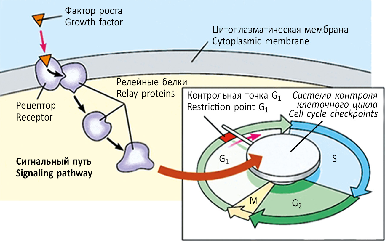 Рис. 1. Регуляция клеточного цикла ростовыми факторами: G1 — Gap 1; G2 — Gap 2; M — митоз; S — синтез ДНК