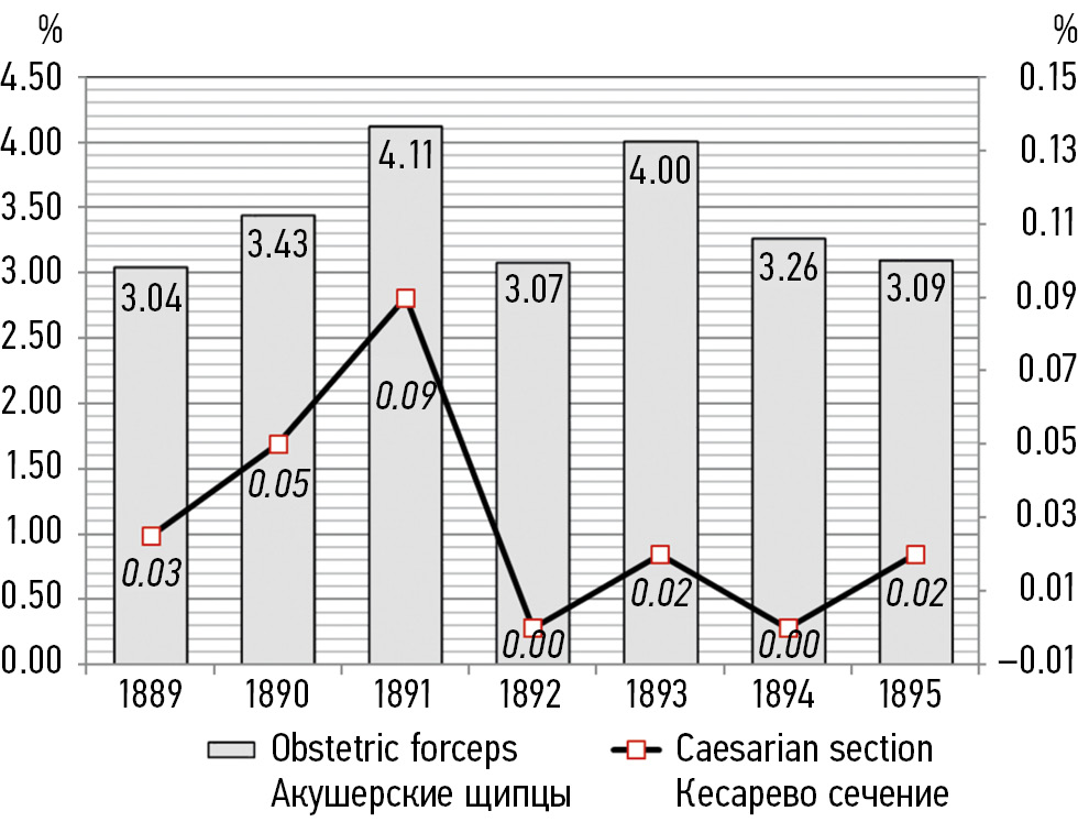 In 1889–1895, the incidence of obstetrical forceps in the Nadezhdinsky Maternity Home (St. Petersburg) was 3%–4%, whereas that of cesarean sections was 0.02%–0.09%, with a total of up to 4000 deliveries per year (Fig. 1) [4–7].