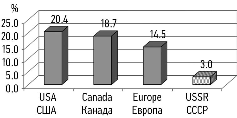 The emergence of a new medical discipline — perinatology — and the new legal status of the fetus as an equal patient led to more frequent decisions on operative delivery in the interests of the fetus [11]. The dramatic increase in the frequency of cesarean sections dates back to the 1980s. Thus, the incidence of cesarean sections increased 3–4 times in all countries worldwide by the mid-1980s, reaching 3% in the USSR (Fig. 3), 14.5% in Europe, 18.7% in Canada, and 20.4% in the United States [12].