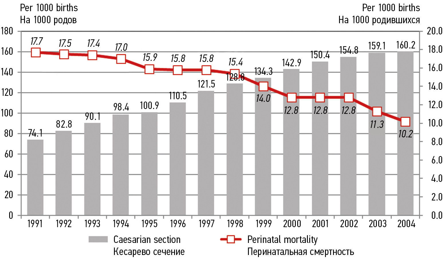 Fig. 4. The frequency of caesarean section and perinatal mortality in the Russian Federation (1991–2004)