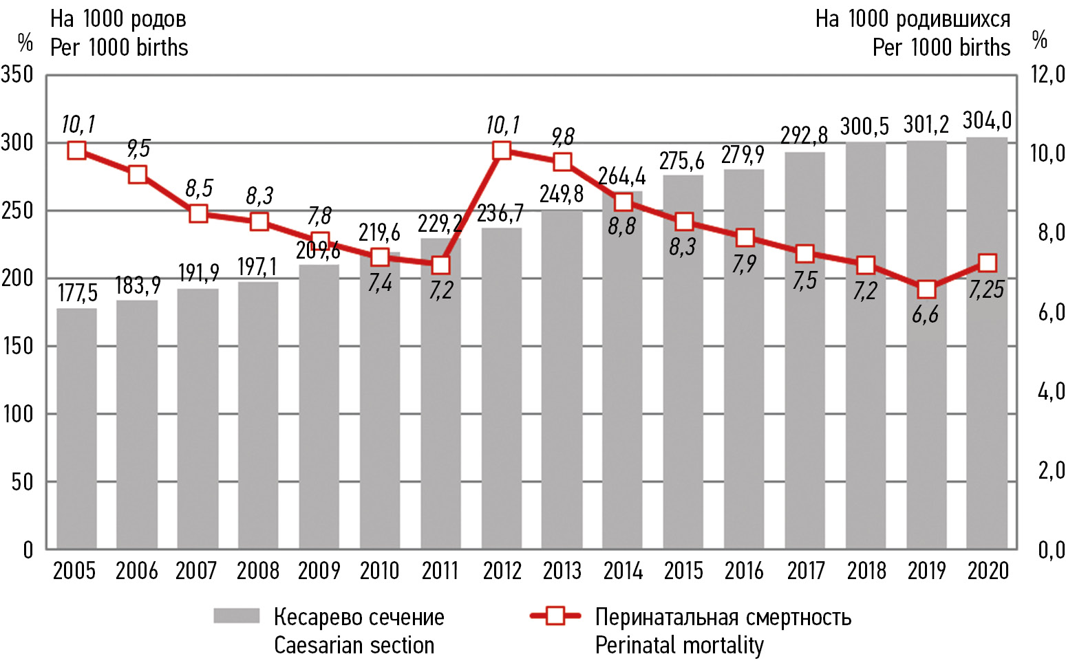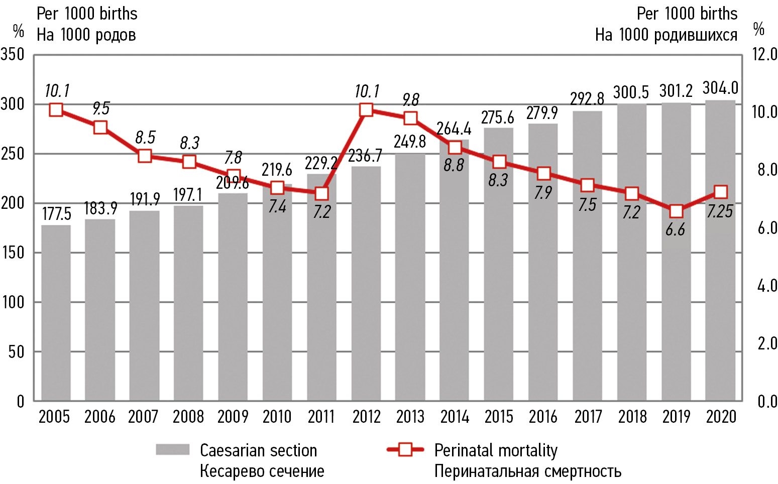 Fig. 5. The frequency of caesarean section and perinatal mortality in the Russian Federation (2005–2020)