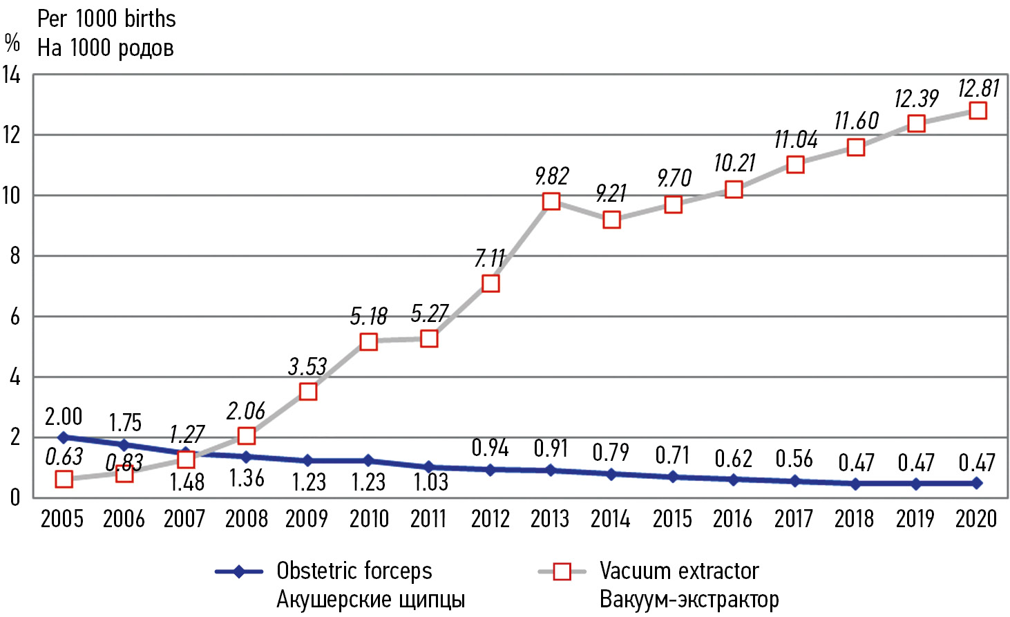 Fig. 7. The frequency of vaginal instrumental delivery in the Russian Federation (2005–2020)