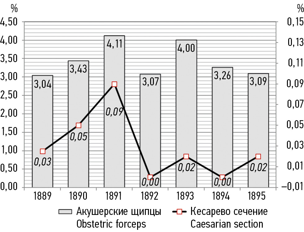 Рис. 1. Частота кесарева сечения и наложения акушерских щипцов (данные Санкт-Петербургского родовспомогательного учреждения, 1889–1895 гг.)