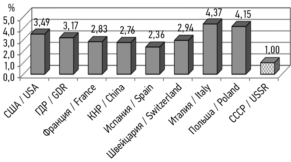 The increase in the number of cesarean sections followed the widespread introduction of sulfonamide and antibacterial drugs in clinical practice. However, even in the 1950s and 1960s, attitudes toward abdominal delivery remained highly restrained owing to the large number of serious complications. Thus, the frequency of cesarean sections averaged only 1% in the Union of Soviet Socialist Republics (USSR) from 1940 to 1960. This occurrence was caused by historically established conservative traditions inherent in obstetrics in general. During the same period, the cesarean section rate was 3.49% in the United States, 3.17% in the German Democratic Republic, 2.83% in France, 2.76% in China, 2.36% in Spain, 2.94% in Switzerland, 4.37% in Italy, and 4.15% in Poland (Fig. 2).
