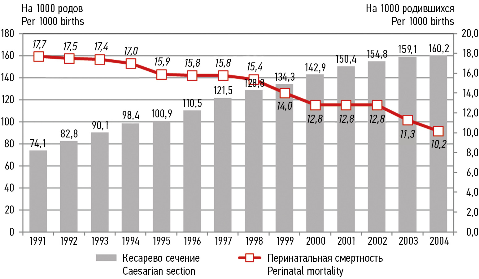 Рис. 4. Частота кесарева сечения и перинатальная смертность в Российской Федерации (1991–2004)