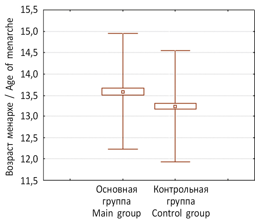 Рис. 1. Возраст менархе у пациенток основной и контрольной групп