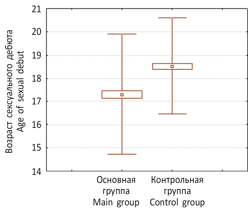 Рис. 2. Возраст сексуального дебюта у пациенток основной и контрольной групп