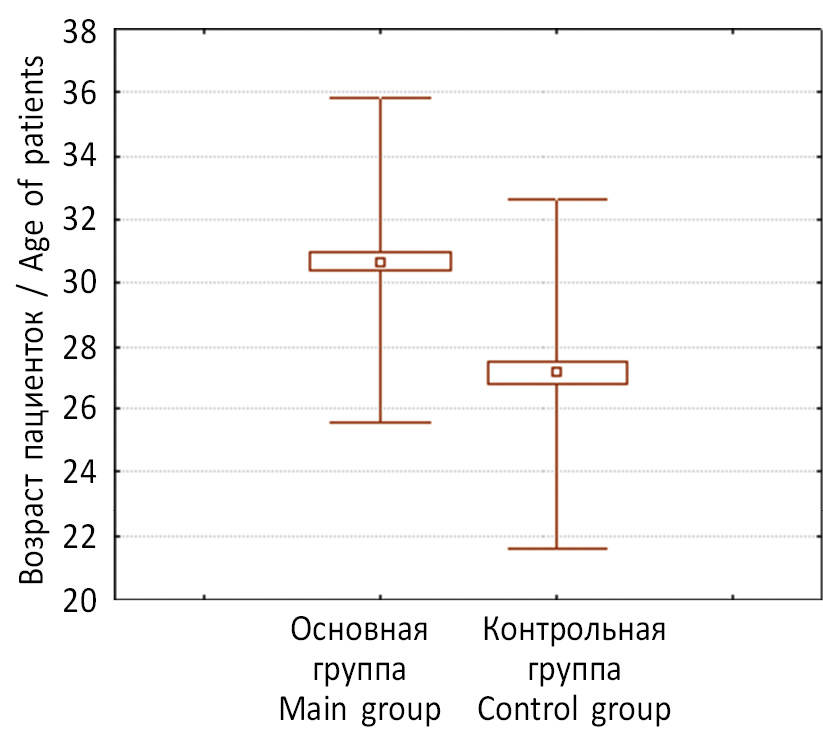 Возраст пациенток основной группы на момент постановки на учет по беременности был достоверно меньше, чем в контрольной. Возраст пациенток при постановке на учет и стандартное отклонение представлены на рис. 3.