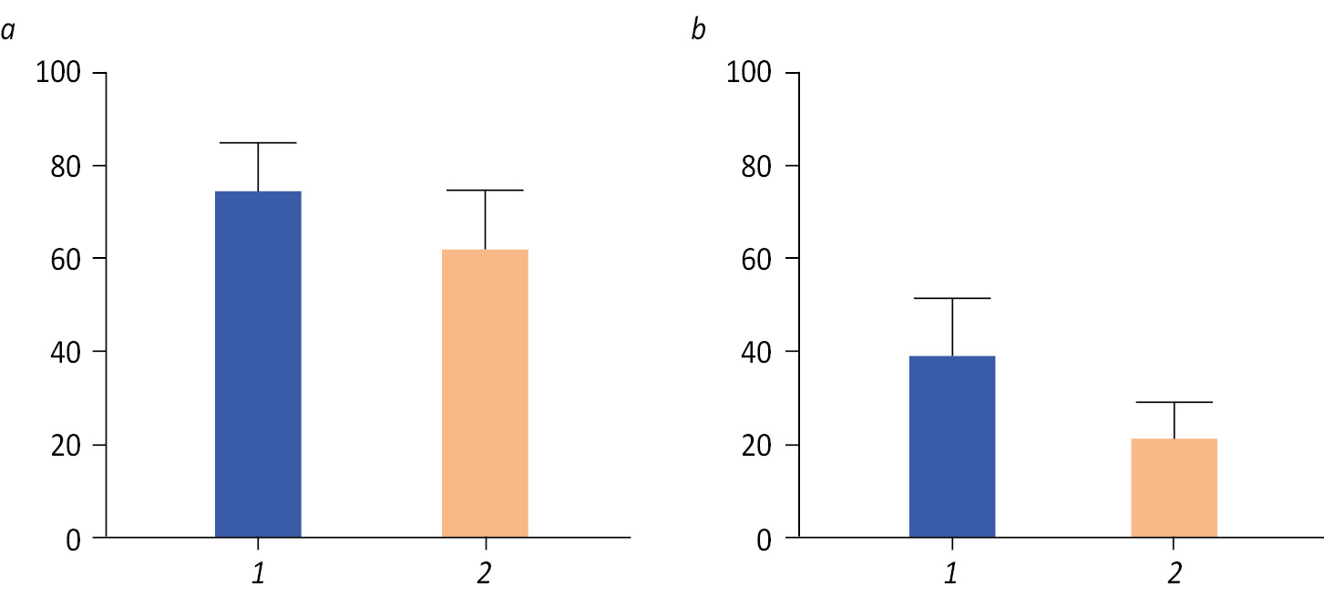 Рис. 1. Количество молока, сцеженное аппаратами «Лактопульс» и Medela Symphony: а — объем молока, сцеженный за первые 10 мин аппаратом «Лактопульс» (1) и аппаратом Medela Symphony (2) (p ≤ 0,05); b — объем молока, сцеженный в последующие 10 мин аппаратом «Лактопульс» (1) и Medela Symphony (2) (p ≤ 0,01)