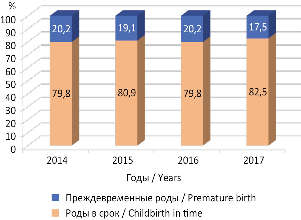 One in five HIV-infected pregnant women had a preterm delivery (19.2%); in 16 women, delivery occurred at weeks 22–27 of gestation (4.5% of the total number of preterm births), 108 (30.2%) patients had a preterm delivery at weeks 28–33, and in 233 (65.3%) women, preterm delivery occurred at weeks 34–36. However, the proportion of preterm deliveries was decreased in 2017 than in 2014 (Fig. 1).