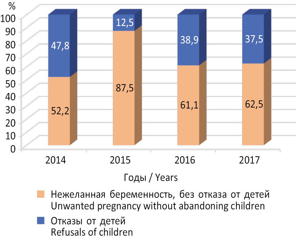 Рис. 3. Отказы от новорожденных в родильных домах ВИЧ-инфицированных женщин с нежеланной беременностью (n = 27; 1,5 % общего количества новорожденных за время исследования)
