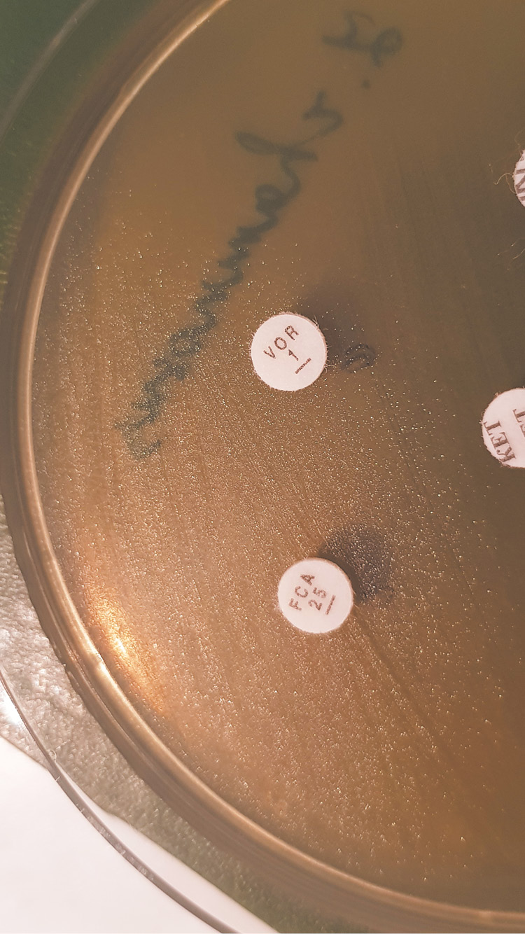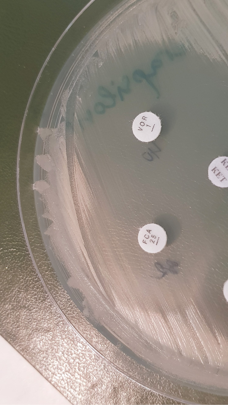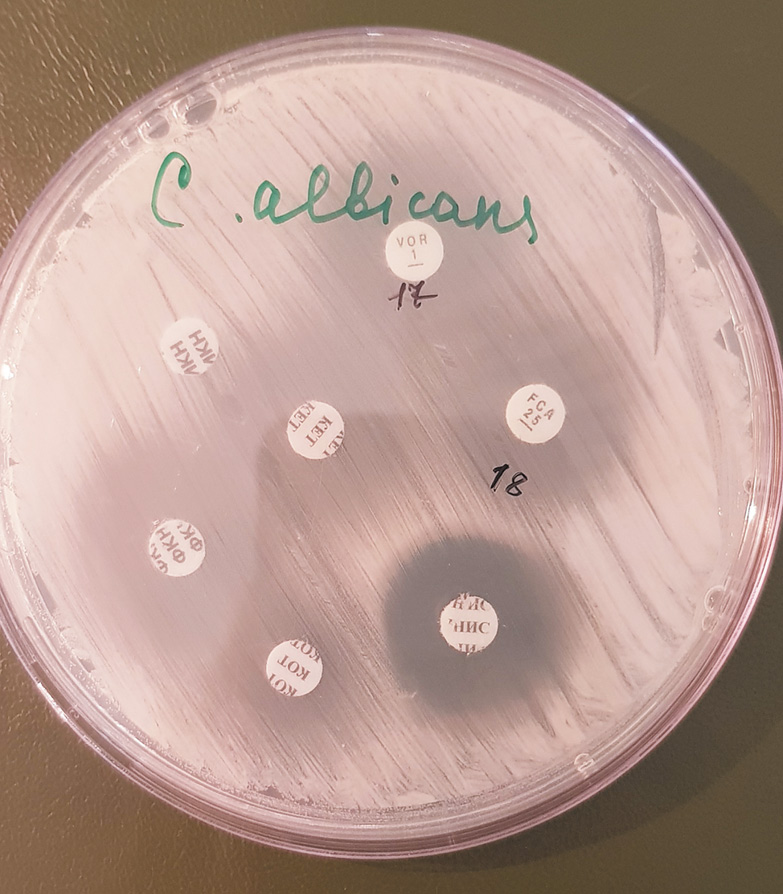 Candida albicans | FCA25 I (18 мм) VOR1 S (17 мм) | Итраконазол R (0 мм) Кетоконазол R (18 мм) Клотримазол S (13 мм) Нистатин S (19 мм) |