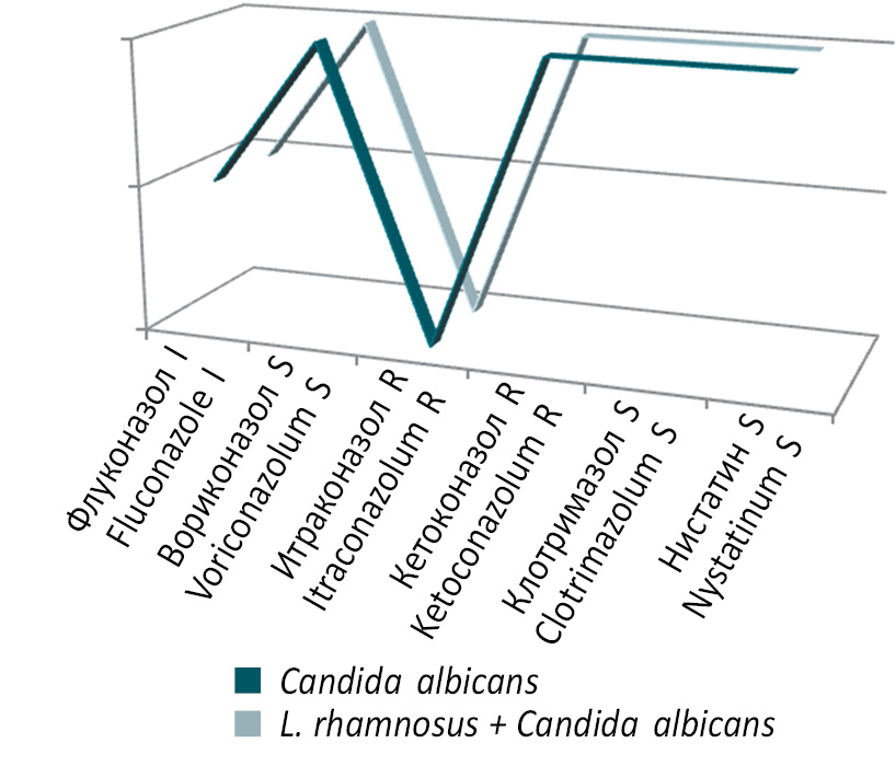L. rhamnosus + Candida albicans | FCA25 I (18 мм) VOR1 S (17 мм) | Итраконазол R (0 мм) Кетоконазол R (19 мм) Клотримазол S (12 мм) Нистатин S (20 мм) |
