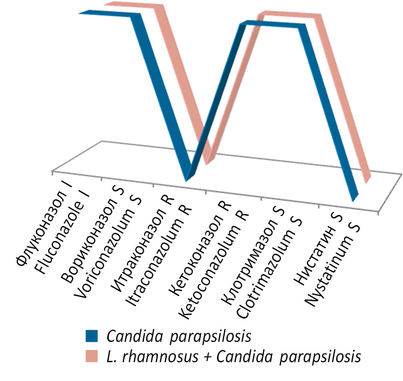 L. rhamnosus + Candida parapsilosis | FCA25 S (25 мм) VOR1 S (30 мм) | Итраконазол R (10 мм) Кетоконазол S (30 мм) Клотримазол S (18 мм) Нистатин R (15 мм) |