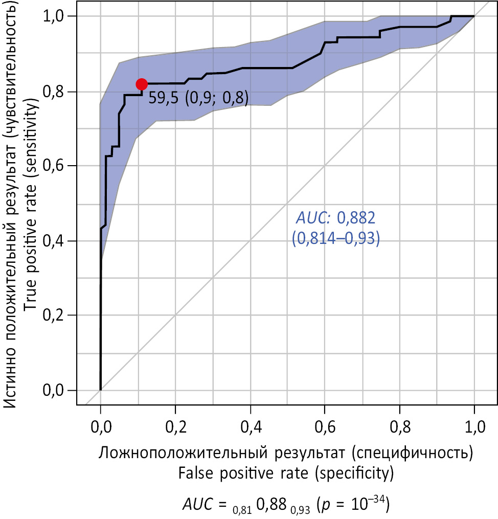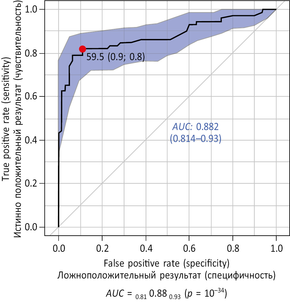 Этот вывод также подтверждают результаты ROC-анализа (рис. 2). Численное значение клинической значимости (показатель AUC) составляет 0,88 (ДИ 0,81–0,93), поэтому определение СРБ можно считать клинически информативным.