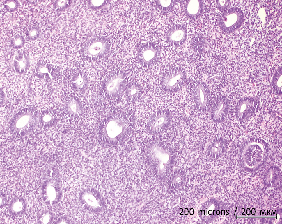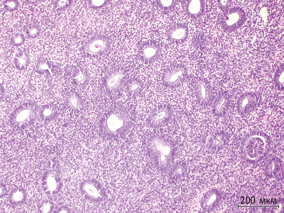 Рис. 1. Гиперплазия эндометрия без атипии у женщины репродуктивного возраста (окраска гематоксилином и эозином, увеличение ×100)