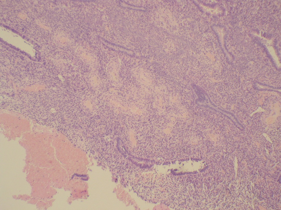 Fig. 1. Endometrial hyperplasia without atypia in women of reproductive age (hematoxylin and eosin staining at ×100 magnification)
