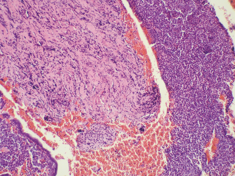 Fig. 3. Fibrous adhesions with severe lymphoplasmocytic infiltration, surrounded by the endometrium with signs of chronic active inflammation (hematoxylin and eosin staining at ×100 magnification)