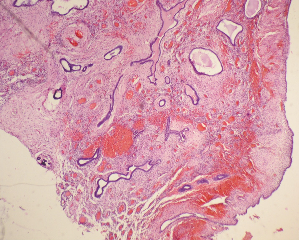 Рис. 4. Железисто-фиброзный полип эндометрия «сенильного типа» с кистозно расширенными железами и выраженным расстройством кровообращения (окраска гематоксилином и эозином, увеличение ×40)