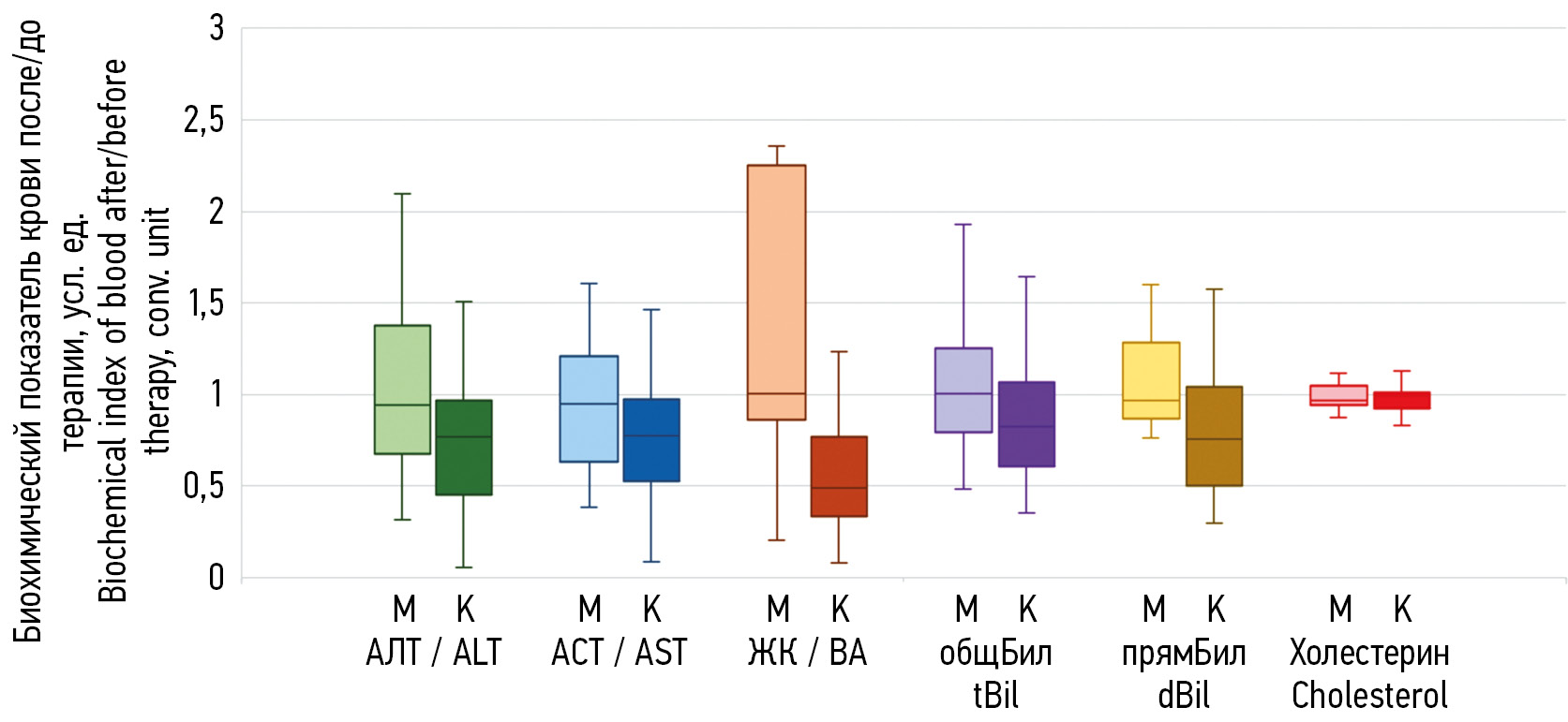 Рис. 1. Биохимические показатели крови при применении одного гепатопротектора и сочетания препаратов: М — монотерапия; K — комбинированная терапия. АЛТ — аланинаминотрансфераза; АСТ — аспартатаминотрансфераза; ЖК — желчные кислоты; общБил — общий билирубин; прямБил — прямой билирубин