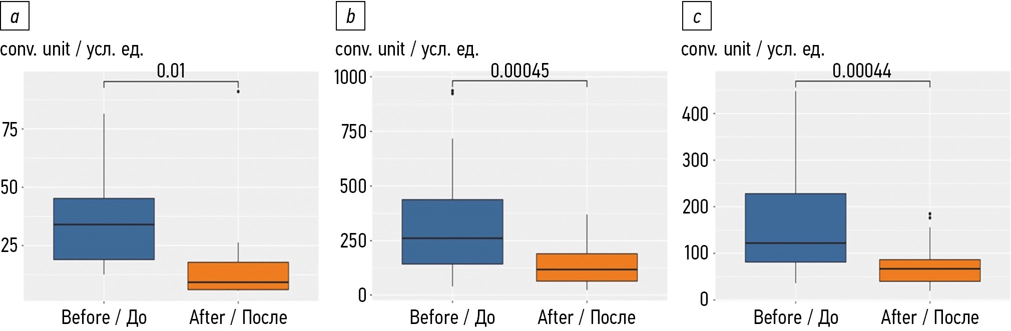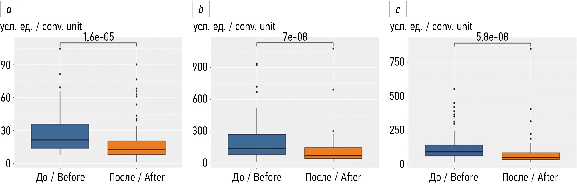 Fig. 2. Indicators of bile acids (a), alanine aminotransferase (b), and aspartate aminotransferase (c) in the blood before and after the use of ursodeoxycholic acid preparations