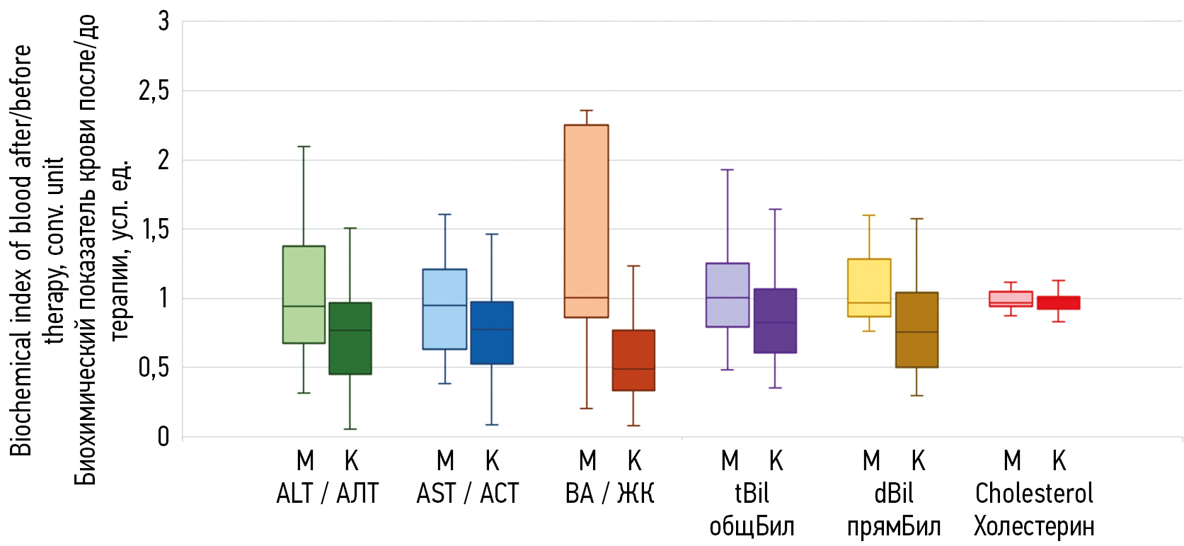 Fig. 1. Biochemical parameters of blood with the use of one hepatoprotector and with their combination: M — monotherapy; K — combination therapy. ALT — alanine aminotransferase; AST — aspartate aminotransferase; BA — bile acids; tBil — total bilirubin; dBil — direct bilirubin