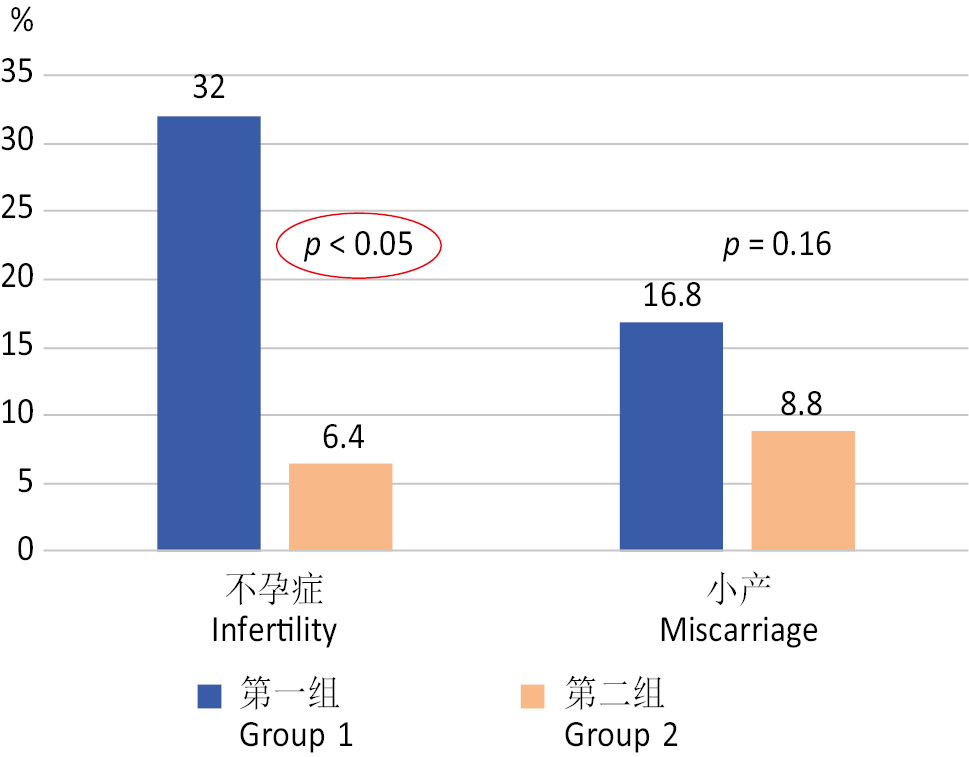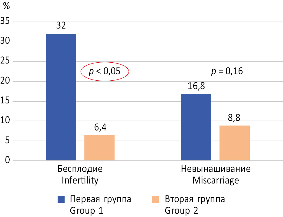 In general, reproductive disorders in the form of infertility or miscarriage were observed in 24 patients (48%) of the first group and 19 (15.2%) of the second group (p < 0.05).