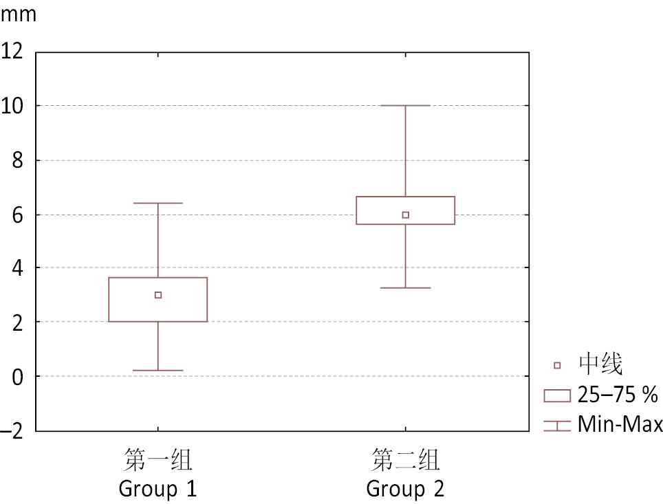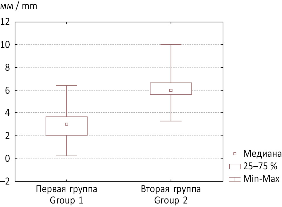 Рис. 2. Диапазон значений толщины рубца у пациенток обследованных групп по данным ультразвукового исследования органов малого таза