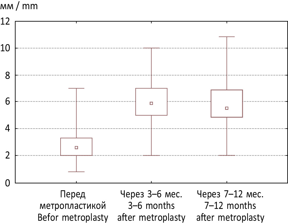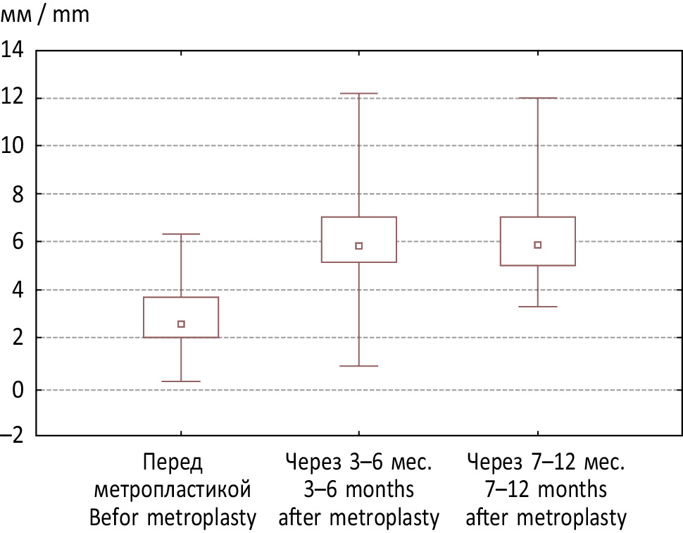 Conclusion. Metroplasty for patients with a diagnosed scar niche can significantly increase the thickness of the myometrium (p < 0.05) and reduce the frequency of complaints of such menstrual irregularities as postmenstrual vaginal bleeding, dysmenorrhea, and hypermenorrhea (p < 0.05).